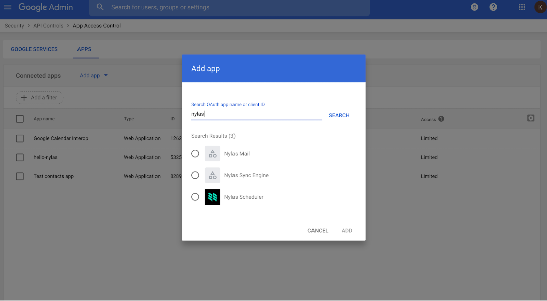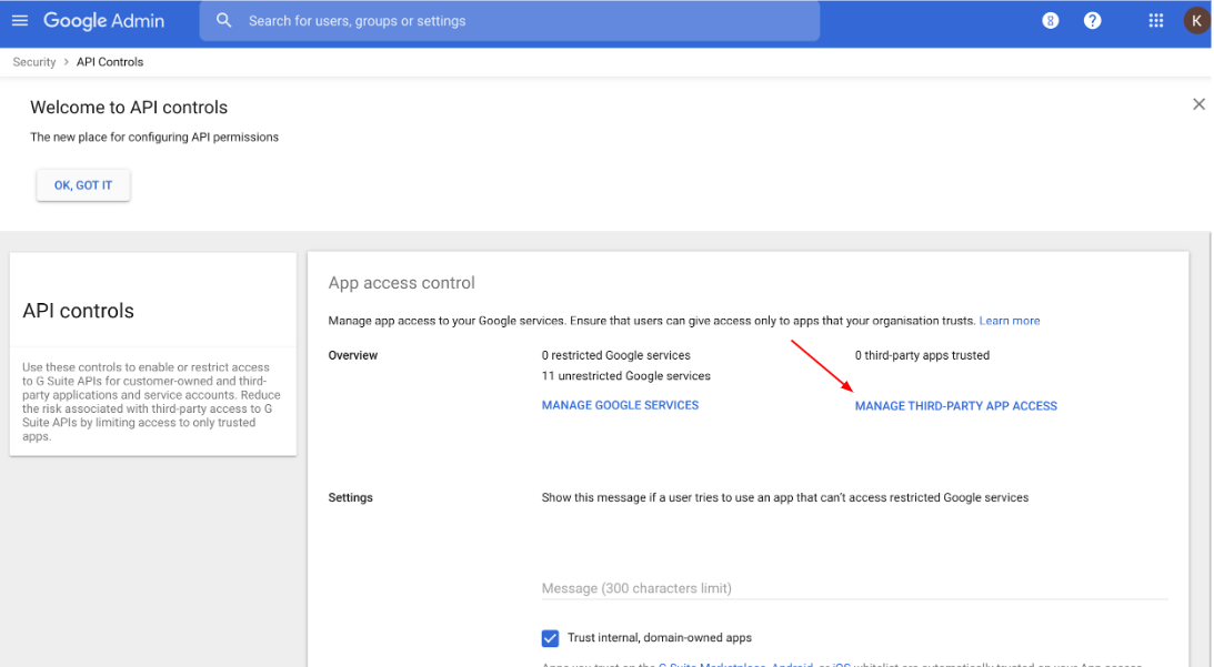 Um superadministrador do G Suite é a única pessoa que pode colocar o CustomerX na lista de permissões. Se o superadministrador colocar o aplicativo na lista de permissões, qualquer pessoa da empresa poderá sincronizar suas contas no aplicativo.