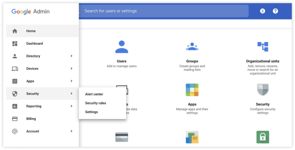 1. Os administradores devem fazer login no console do Google para administradores; no painel de controle do Google Admin, vá para “Segurança” e abra “Configurações”.