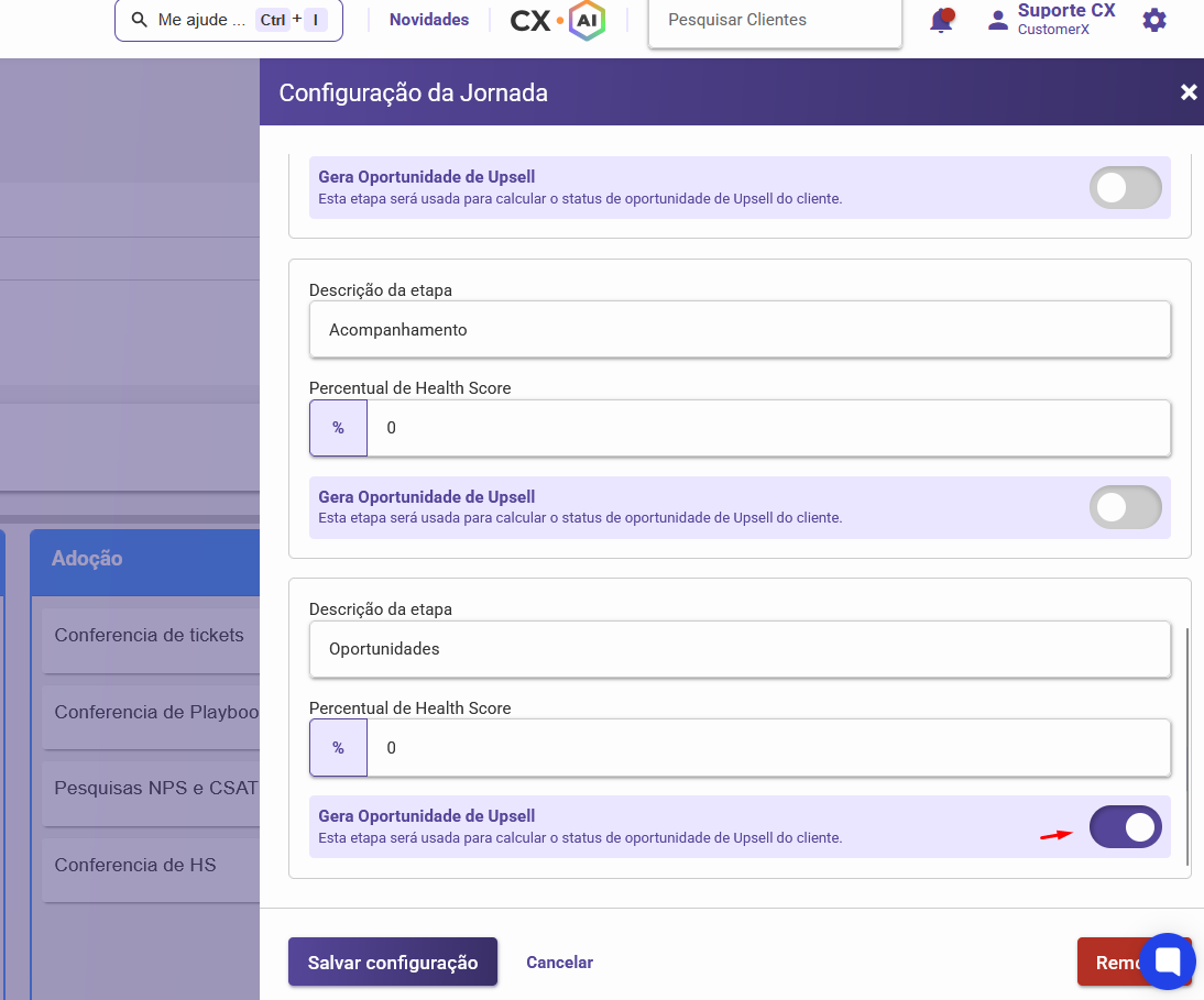 As oportunidades de Upsell identificadas pelo CSM são informadas no CustomerX como tarefas em uma ou mais listas da jornada.