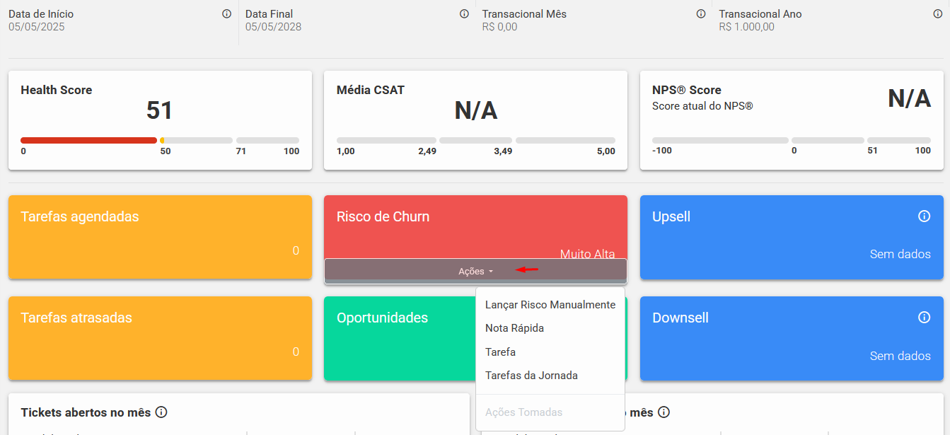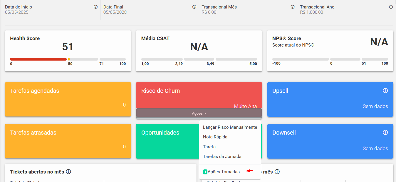 As ações vinculadas ao card de Risco de Churn serão listadas na opção "Ações Tomadas"