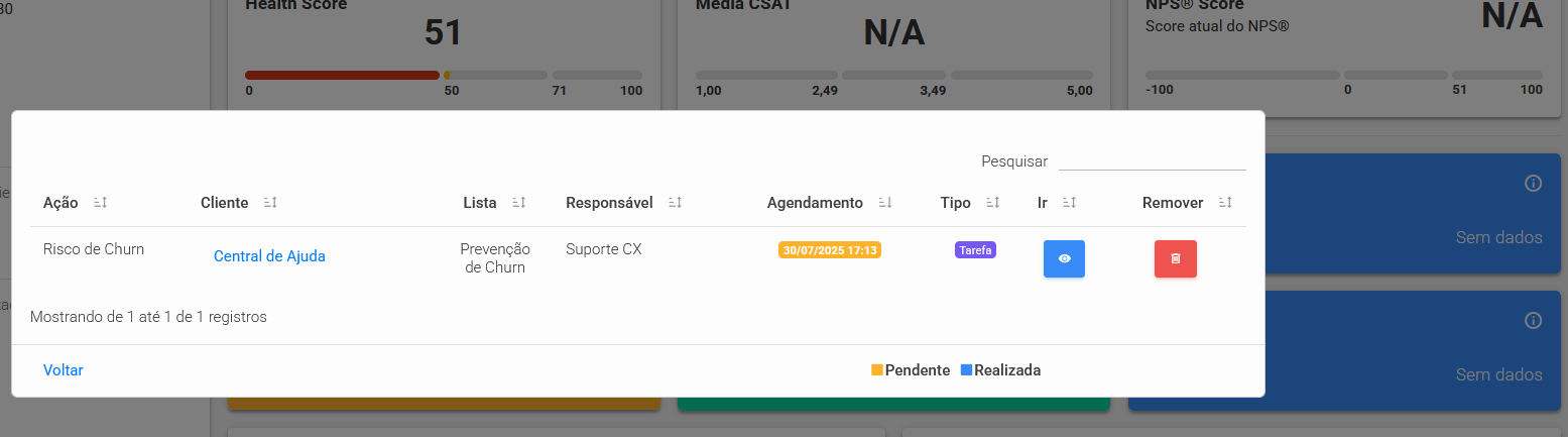 Esse filtro exibirá apenas as tarefas vinculadas registradas aos riscos de churn, facilitando o acompanhamento e a gestão dessas ações.