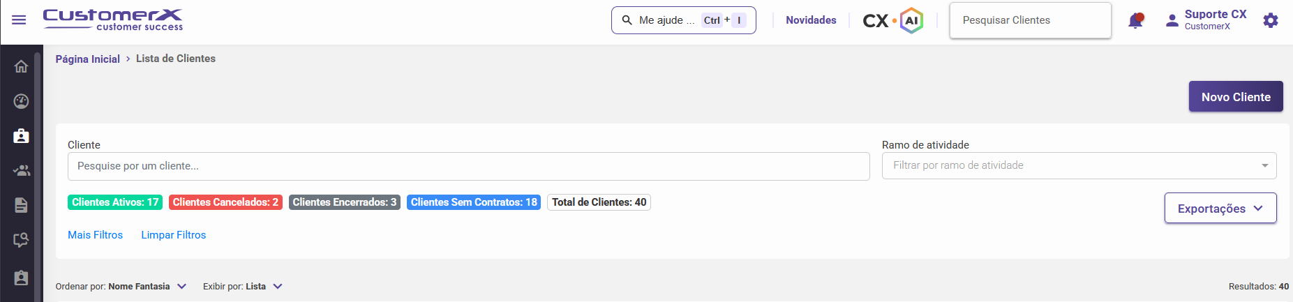 No CustomerX, as informações dos clientes podem ser acessadas por meio da tela de Lista de Clientes, localizada no menu lateral esquerdo, em Clientes.