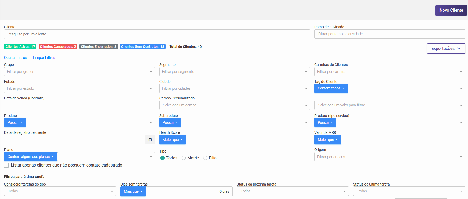 Na tela de clientes, também é possível exportar a relação de clientes em formato de planilha, considerando os filtros aplicados, por meio do botão "Exportações". Há três tipos de exportação disponíveis: