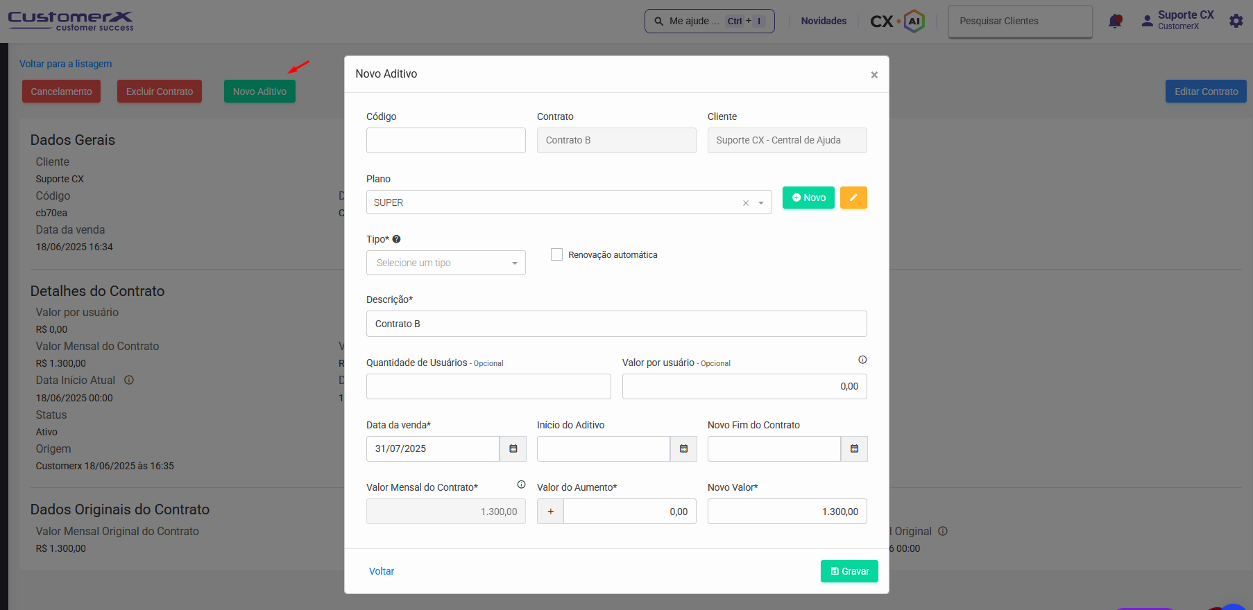 Ao longo da permanência de um cliente na base, pode haver a necessidade de alterar informações originais do contrato, como valores, prazo de vigência ou quantidade de usuários.