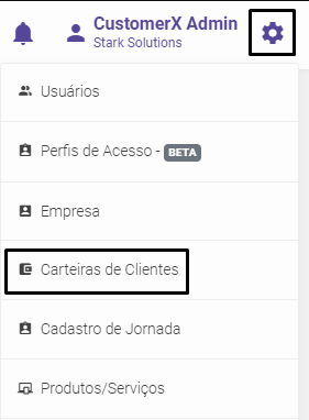 O cadastro e seleção de clientes para a carteira é feita na engrenagem superior direita > Carteiras de Clientes.