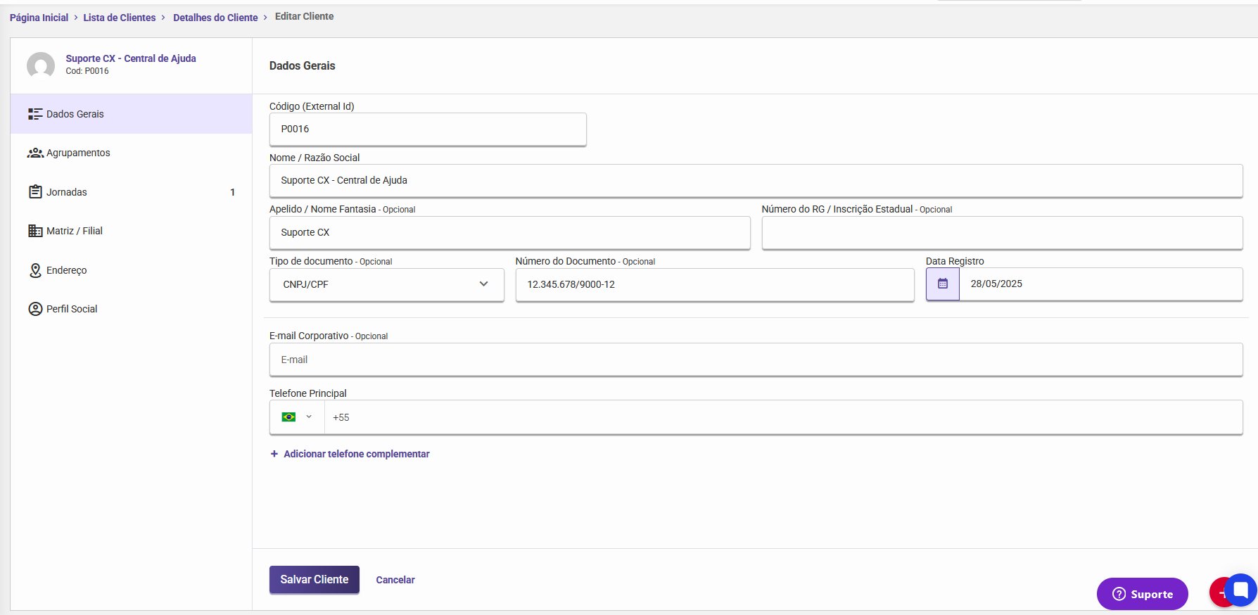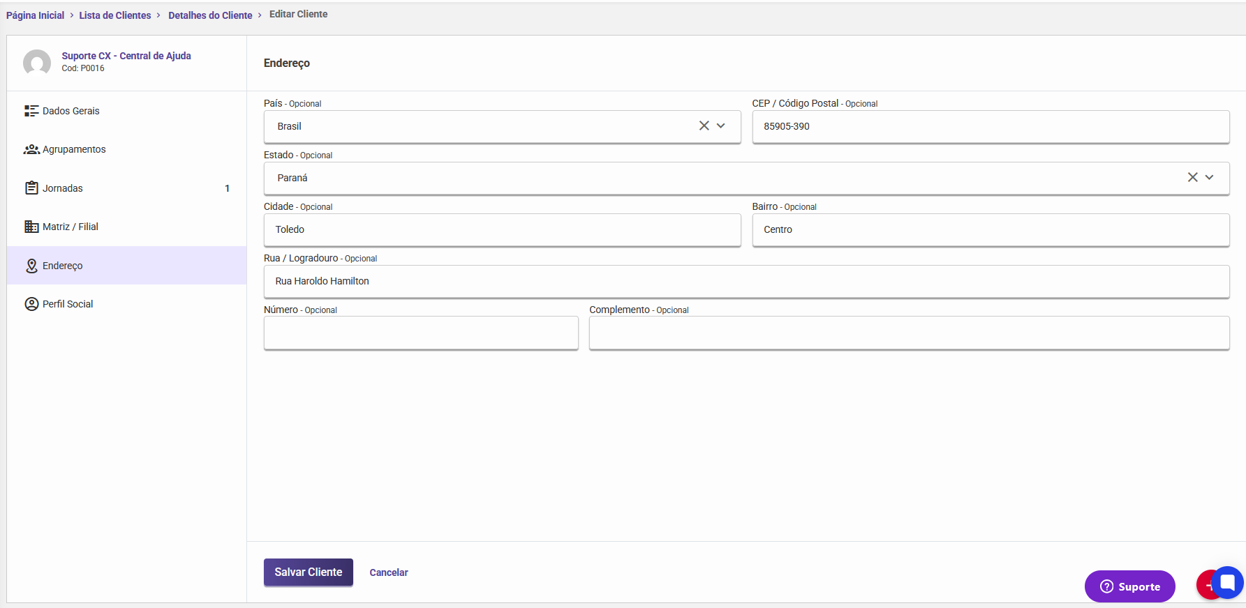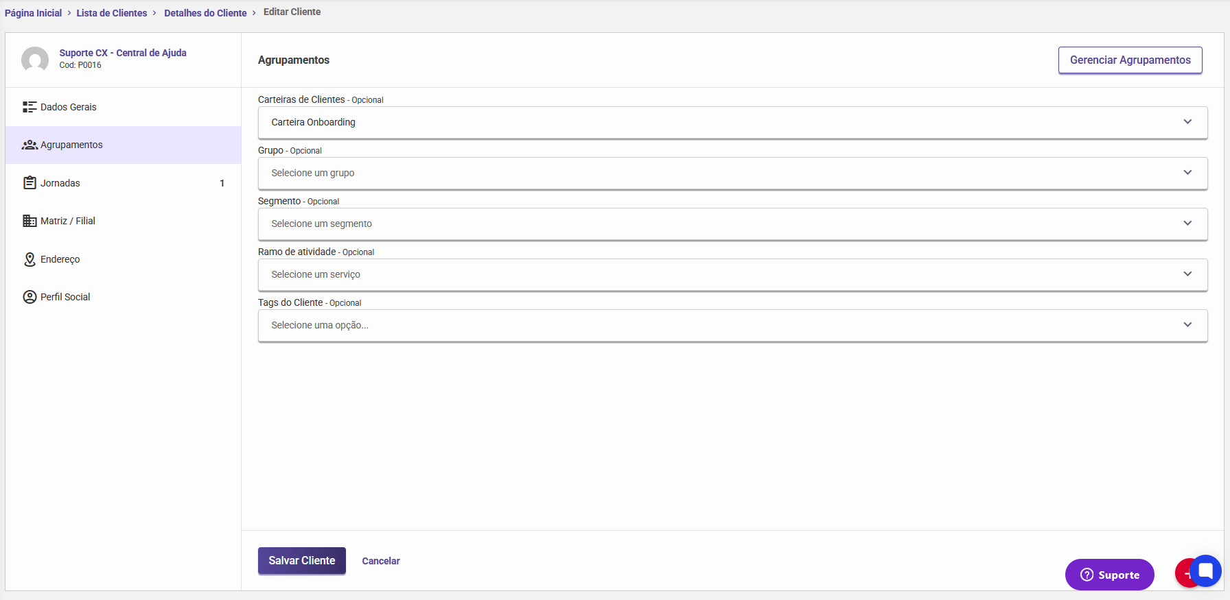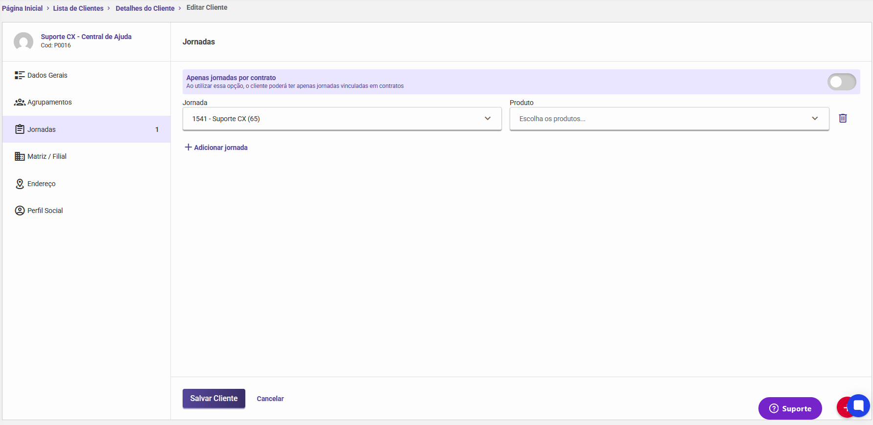 Importante: Para que qualquer alteração seja efetivada, é necessário clicar no botão "Salvar cliente" ao final da tela.