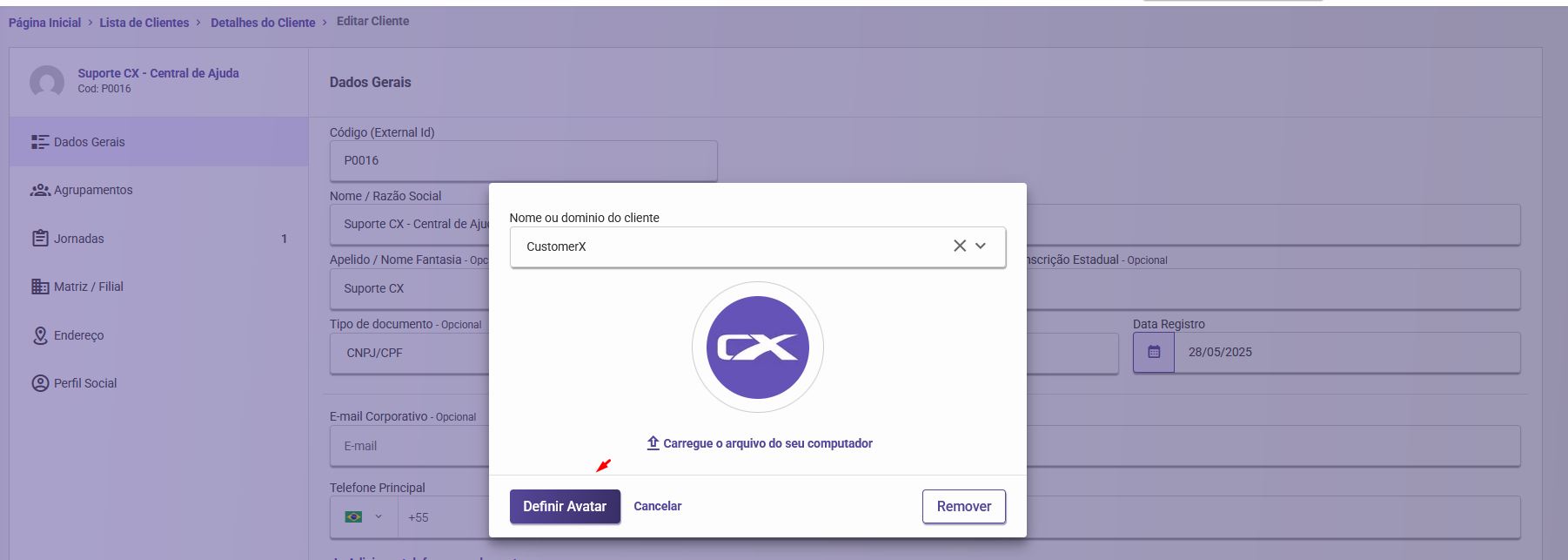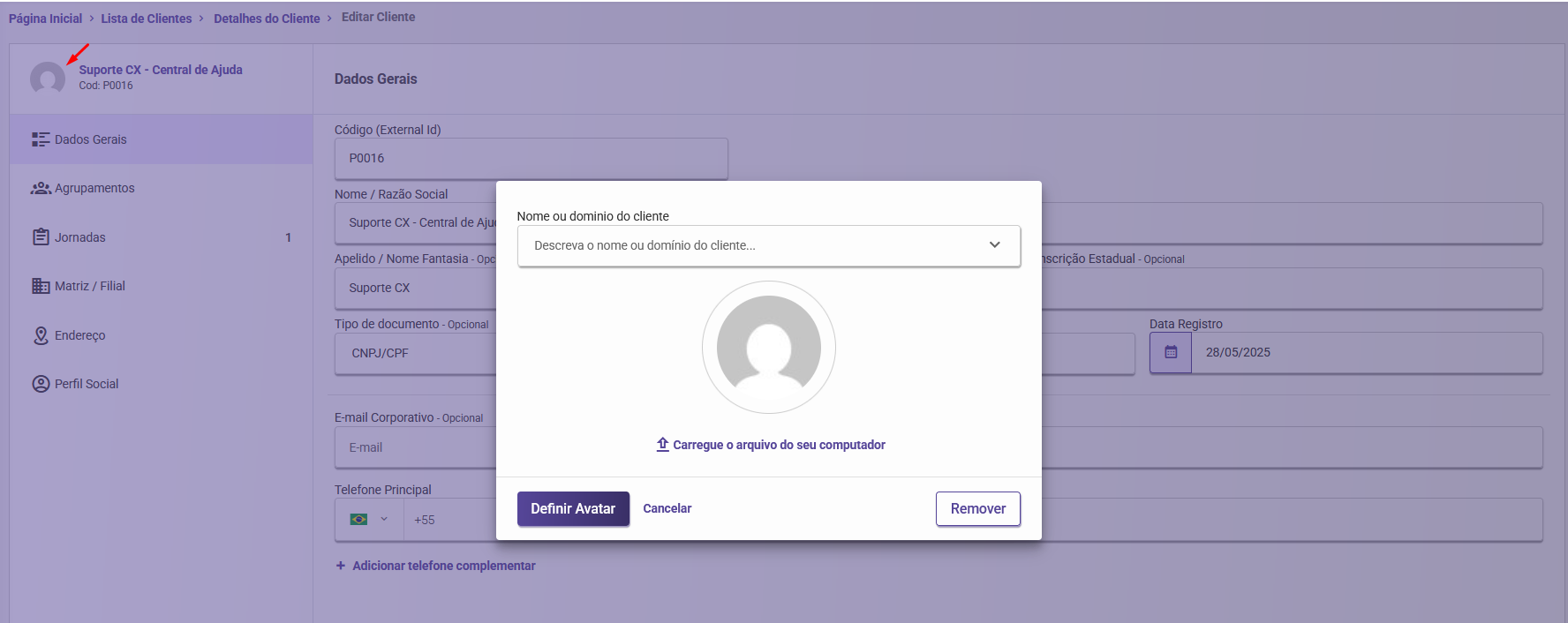 Fazer o upload de uma imagem para utilizar como avatar, facilitando a visualização e personalização na tela de detalhes do cliente.