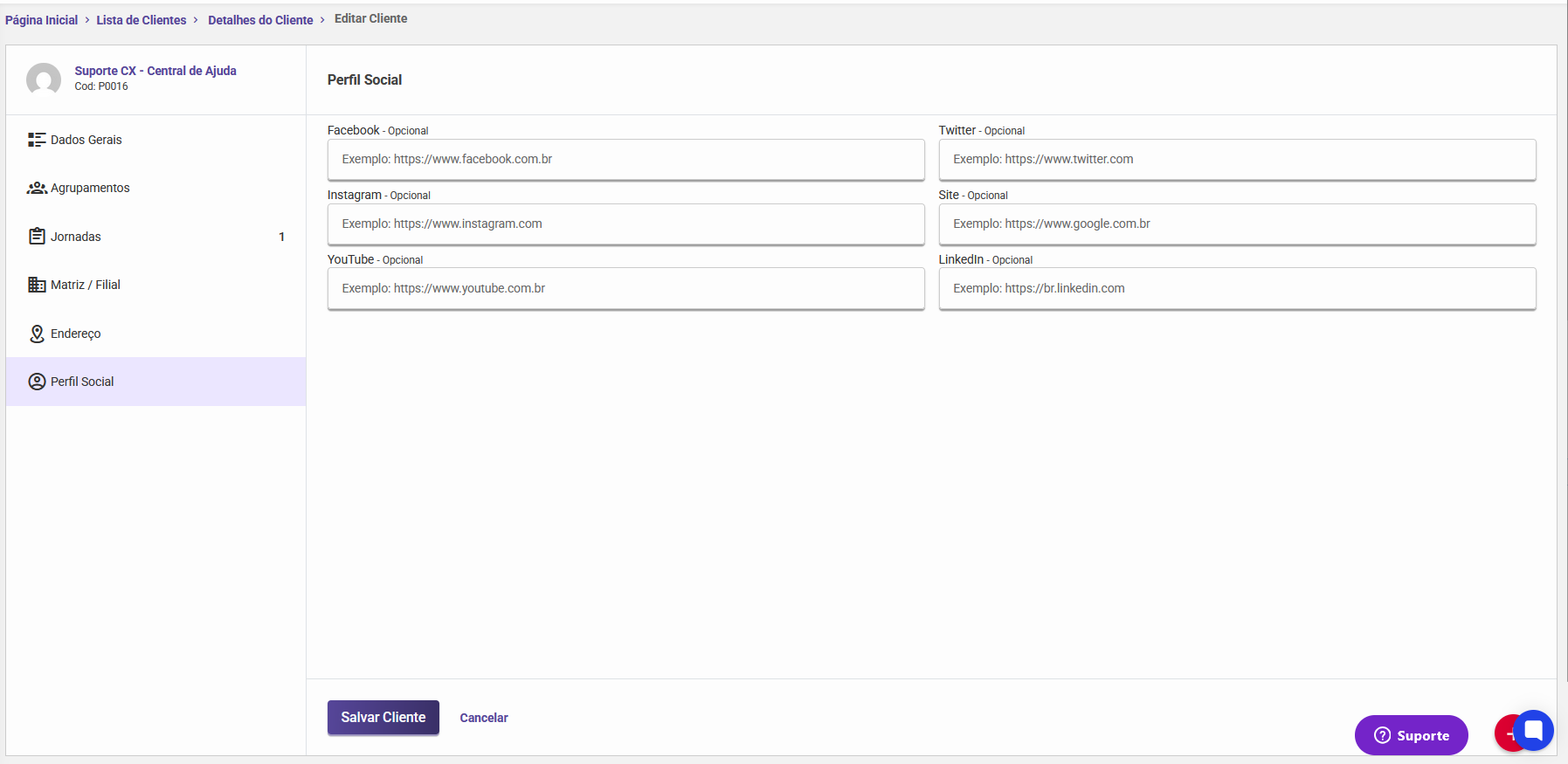Nesta seção, utilize os campos disponíveis para inserir os links das redes sociais do cliente. Isso facilita o acesso rápido a essas informações diretamente na tela de detalhes do cliente.