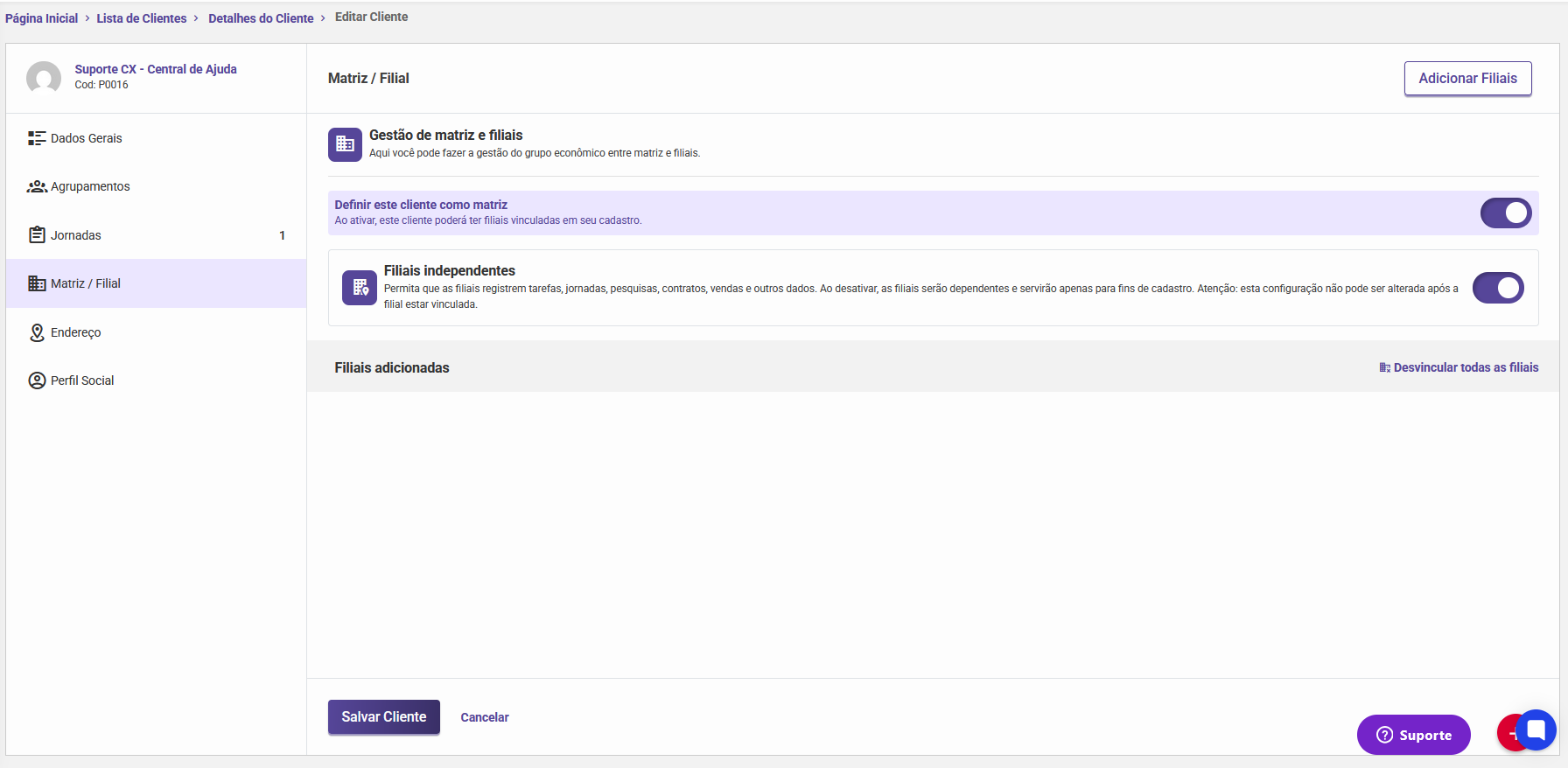 É possível definir um cliente como matriz, o que permitirá o vínculo de outras filiais ao seu cadastro.