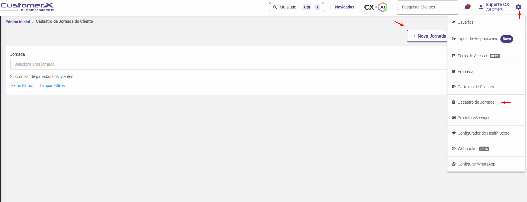 E após ir para a tela de Cadastro de Jornada do Cliente, clique em + Nova Jornada.