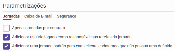 Adicionar usuário logado como responsável nas tarefas da jornada: essa configuração faz com que toda vez que uma tarefa da jornada seja gravada ou concluída o usuário que está executando a ação seja atribuído como responsável. Caso essa opção não esteja marcada, se o usuário responsável da tarefa não estiver definido ele deverá ser selecionado manualmente antes de gravar qualquer alteração em uma tarefa da jornada.