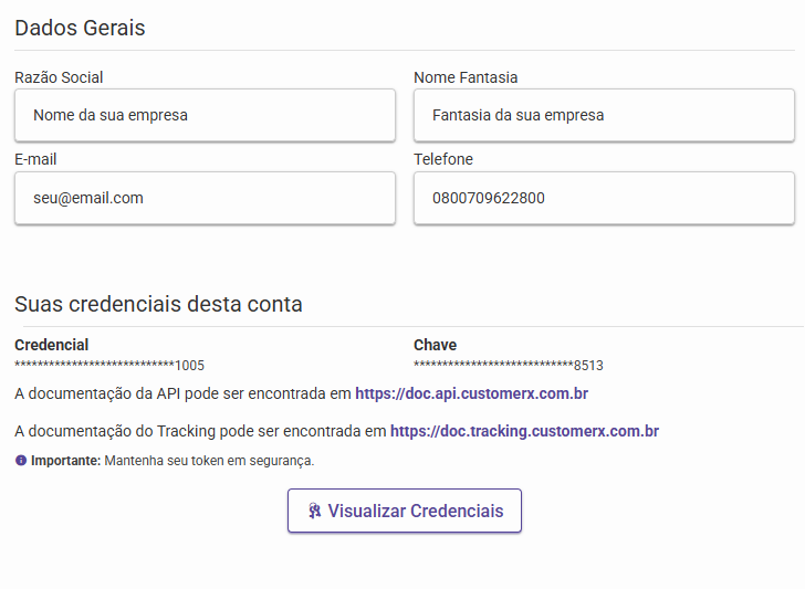 Na próxima tela é apresentado os Dados Gerais e as Credenciais da conta utilizada para autenticação na API de Tracking.