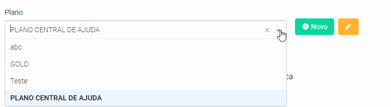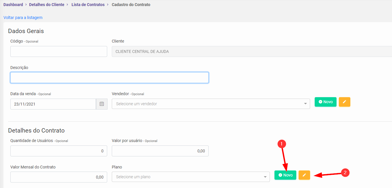 3) Clique em Novo Contrato. Ao lado do campo "Plano" temos o botão "+ Novo" para criar novo plano e ao lado temos um botão "ícone lápis" para editar.