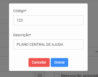 4) Para criar, informe o código (ID) do plano e descrição, em seguida, clique em "Gravar'.
