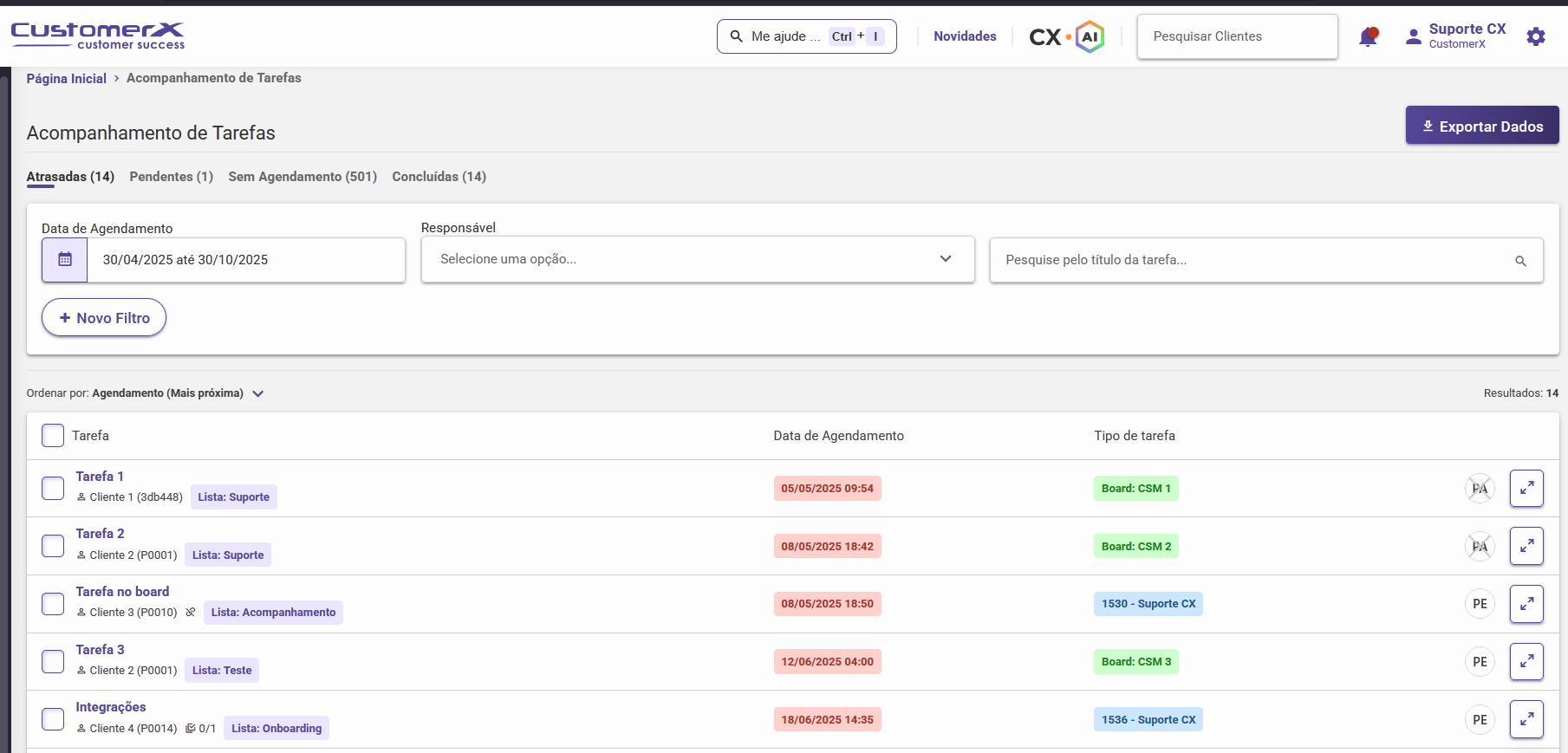 Para acompanhar todas as tarefas realizadas (filtrando por CSM, cliente, carteira, entre outros critérios), utilize a tela "Acompanhamento de Tarefas". Nela, é possível visualizar tanto as tarefas do board pessoal quanto as da jornada, organizadas pelos seguintes status: