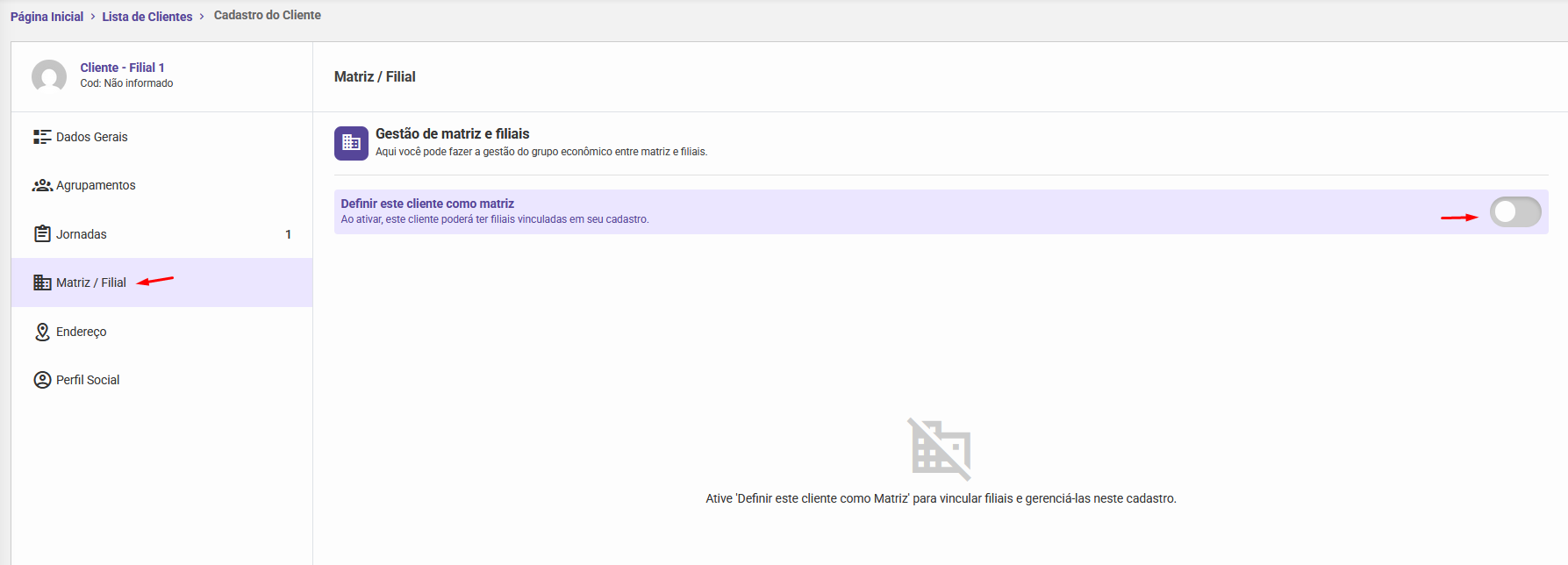Na tela de Cadastro ou Edição de Clientes, localize a seção “Matriz / Filial” no menu lateral esquerdo.