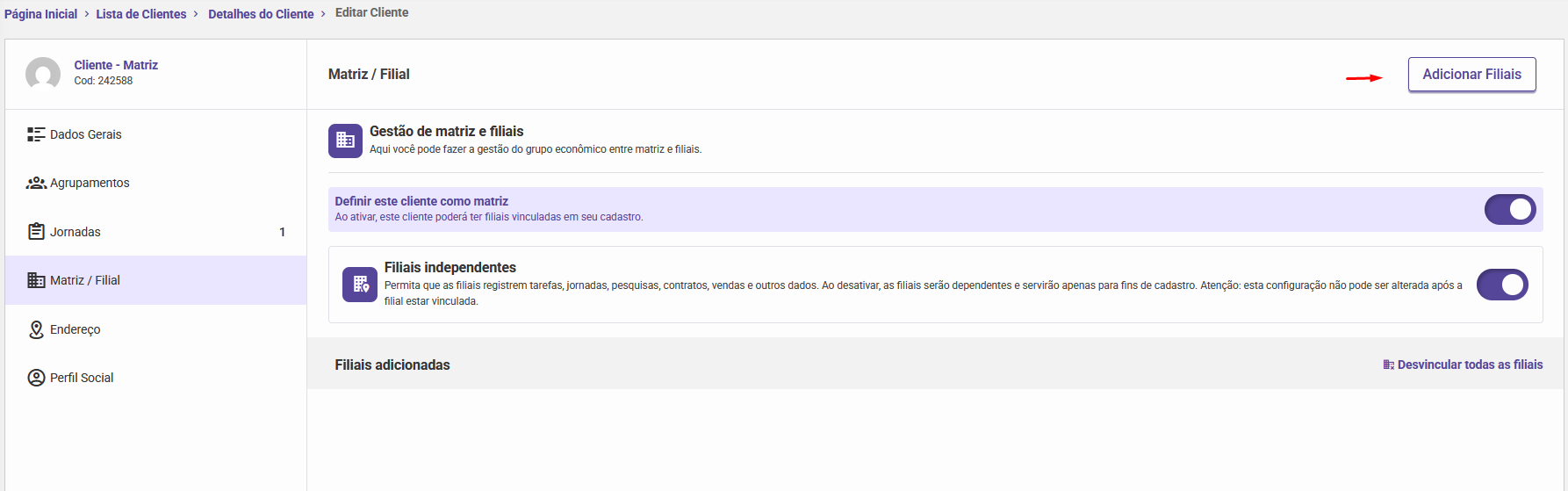 O vínculo entre Matriz e Filiais é configurado conforme descrito acima e influencia diretamente a forma como os dados são exibidos e gerenciados na plataforma.