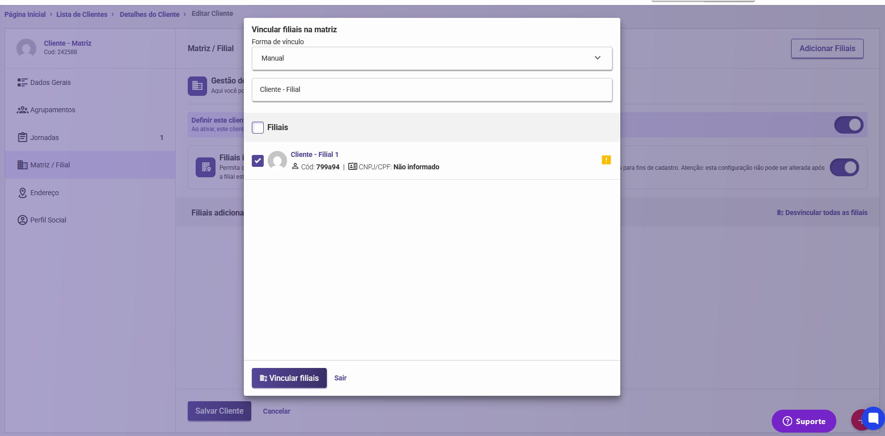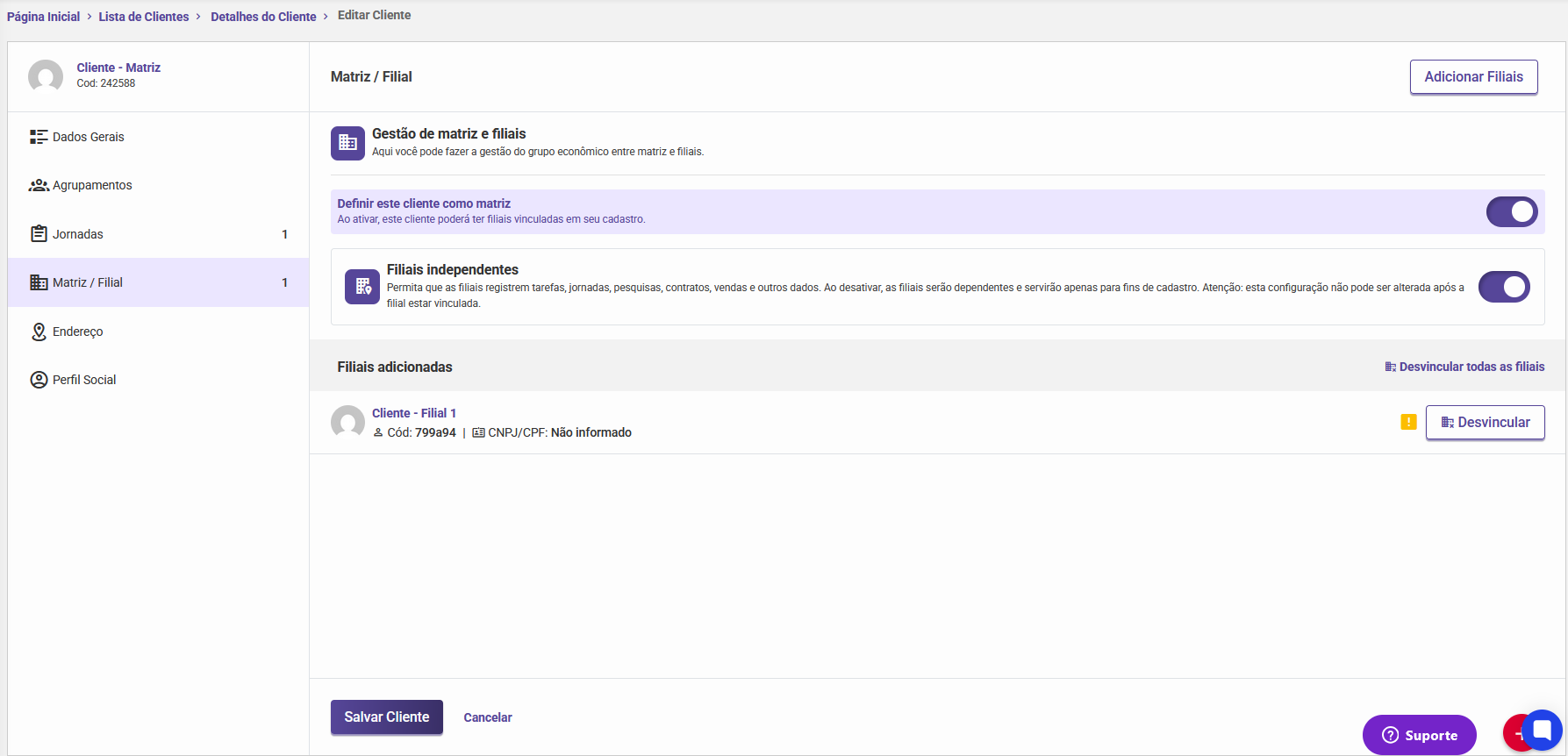O gerenciamento da Carteira de Clientes é unificado: ao alterar a carteira da Matriz, essa mudança é replicada automaticamente para todas as filiais dependentes.