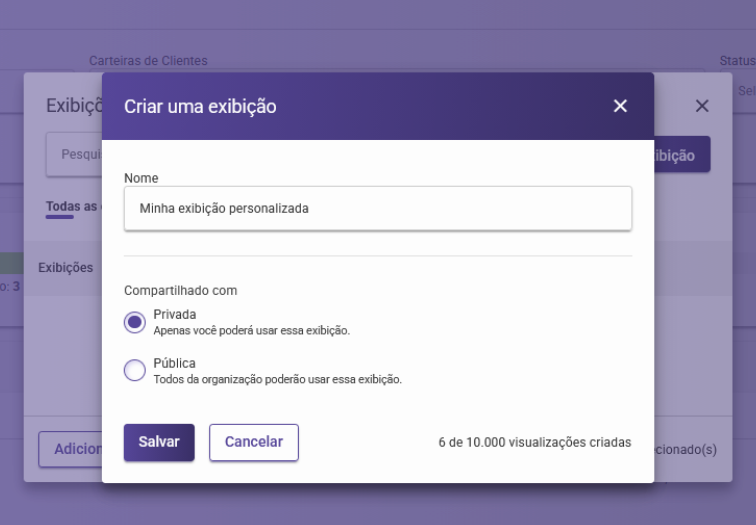 Criar visualizações privadas (somente para você) ou públicas (compartilhadas com toda a equipe)
