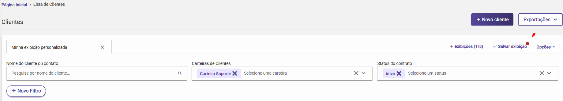 Com a exibição selecionada, aplique os filtros que deseja (como período, carteira, tipo de dado, entre outros). Sempre que houver alterações não salvas, aparecerá um indicador vermelho no botão Salvar exibição, mostrando que existem ajustes pendentes: