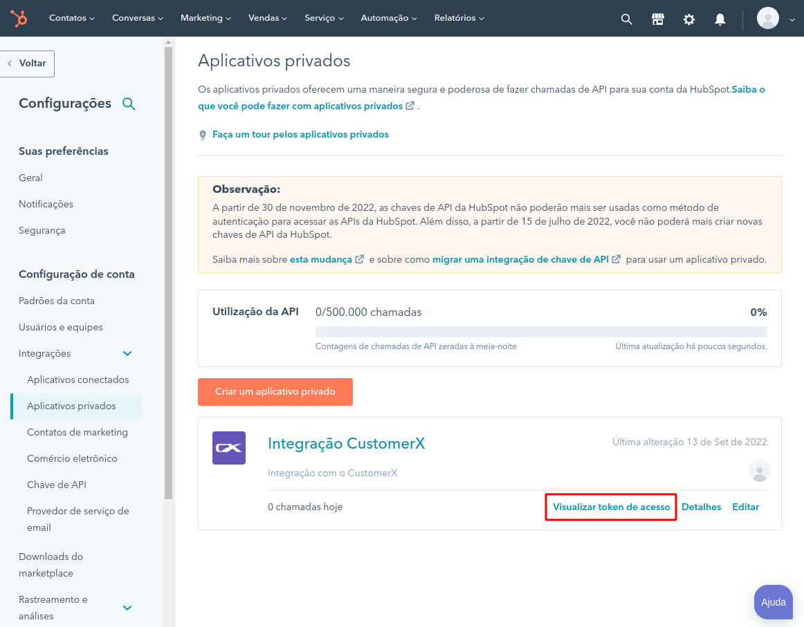O token também poderá ser acessado na pagina inicial de aplicativos clicando em Visualizar token de acesso.