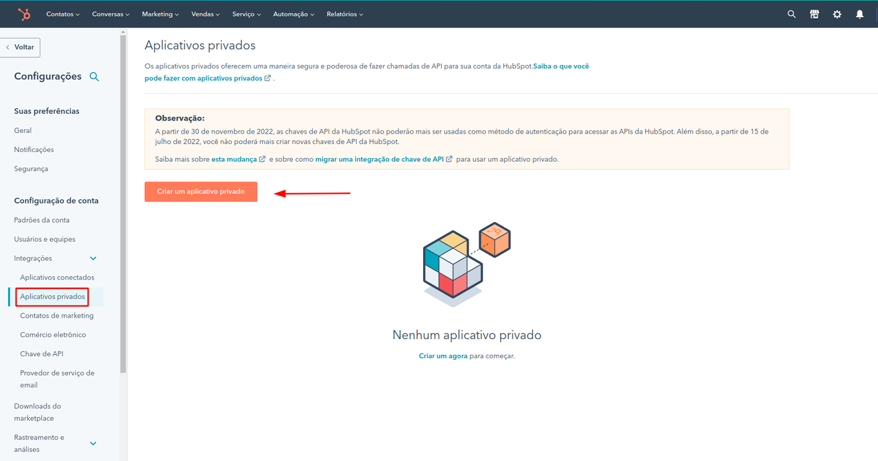 No menu principal acesse Integrações > Aplicativos Privados, depois clique no botão Criar um aplicativo privado.