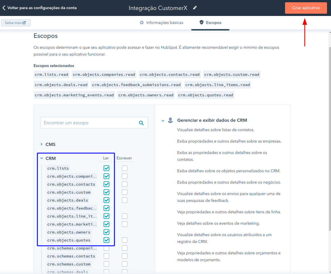 Na aba Escopos, na opção CRM, selecione a opção Ler, de lists e de todas as opções de objects, como mostra a imagem abaixo. Após selecionar os escopos clique no botão Criar aplicativo.