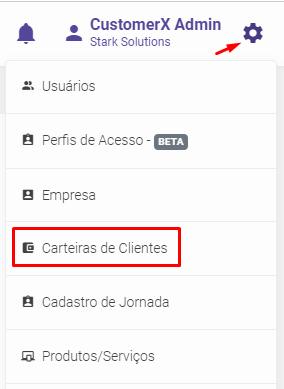 Para adicionar vários clientes a uma carteira, acesse a engrenagem superior direita > Carteira de Clientes.