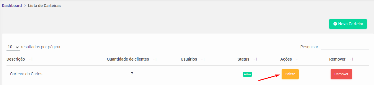 Selecione a carteira que deseja incluir ou editar os clientes vinculados e clique em editar