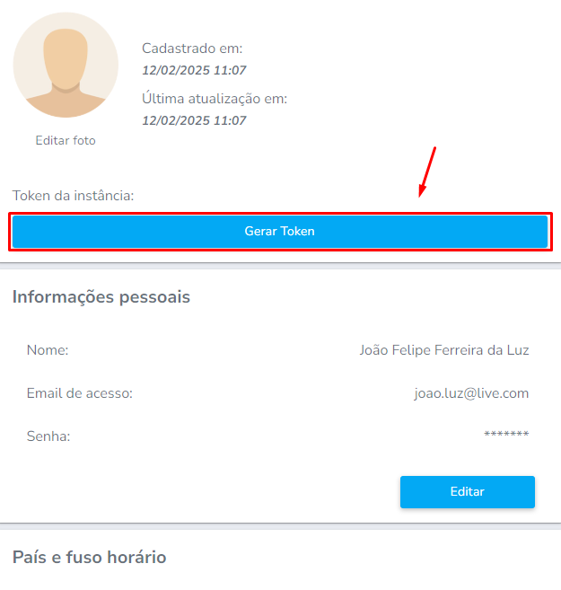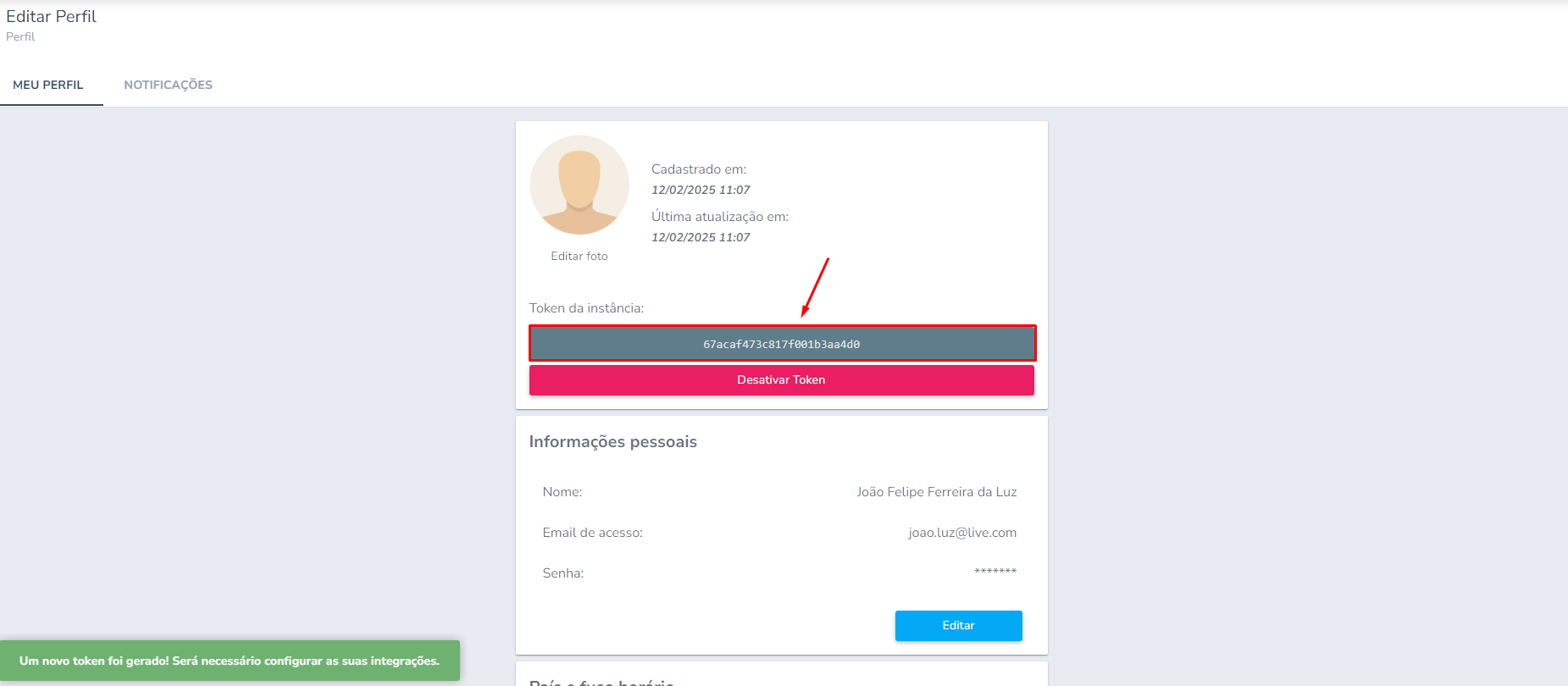 Passo 7: Clicar no botão Gerar Token que consta dentro da tela de Perfil: