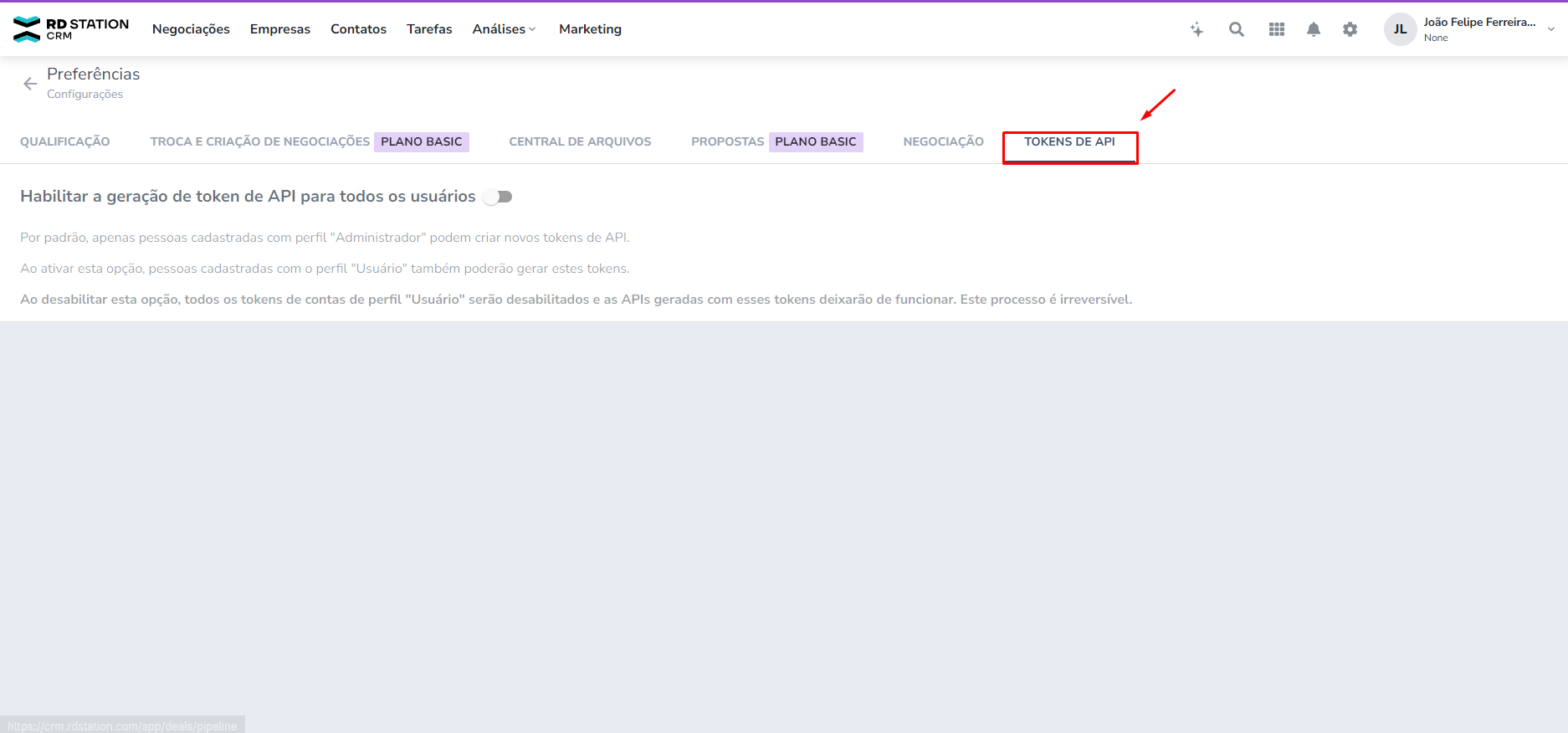 Atenção: o botão Desativar token dos usuários desfaz todas as integrações via API ou webhook do usuário, de forma irreversível. Mesmo que depois o usuário clique novamente no botão Gerar token, será gerado um código diferente do anterior e as integrações precisarão ser refeitas. Portanto, só utilize esse botão se realmente houver a intenção de desfazer as integrações.