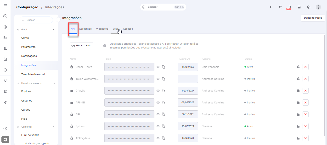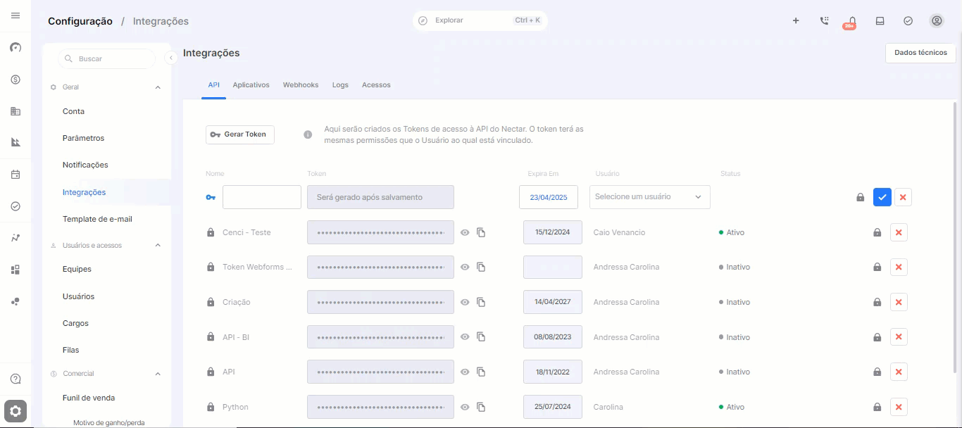 Para gerar o Token do Néctar CRM é necessário fazer os seguintes passos.