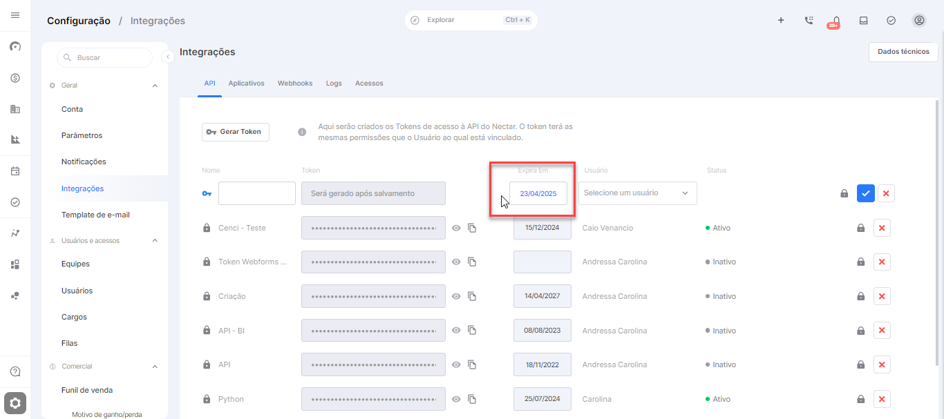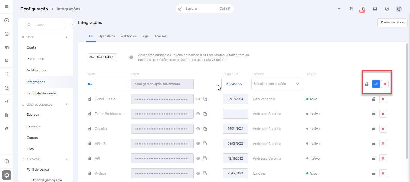 Período de Vigência: Defina por quanto tempo o token será válido. Isso pode ser uma data de expiração ou um período específico (recomendasse colocar, 9999 dias).