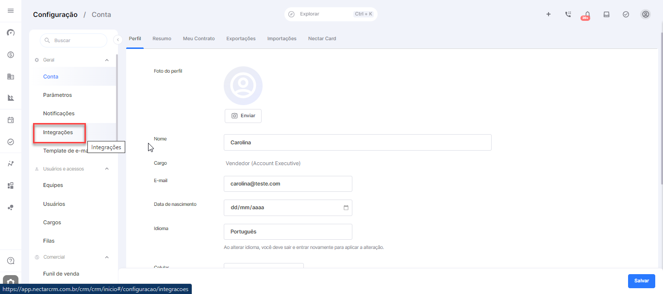 Passo 3: Dentro das configurações, procure pela opção "Integrações”, onde você gerencia as integrações e tokens de acesso: