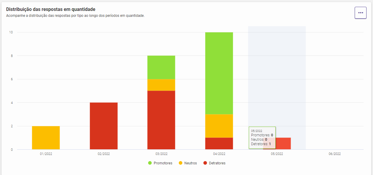 A evolução do score é uma análise gráfica das respostas de NPS que visa exibir o resultado das pesquisas ao longo do período, bem como a distribuição de respostas.