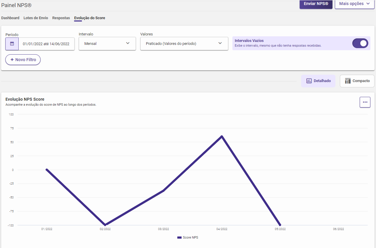 Intervalos vazios: opção que define se período sem respostas são exibidos ou ocultados do gráfico.