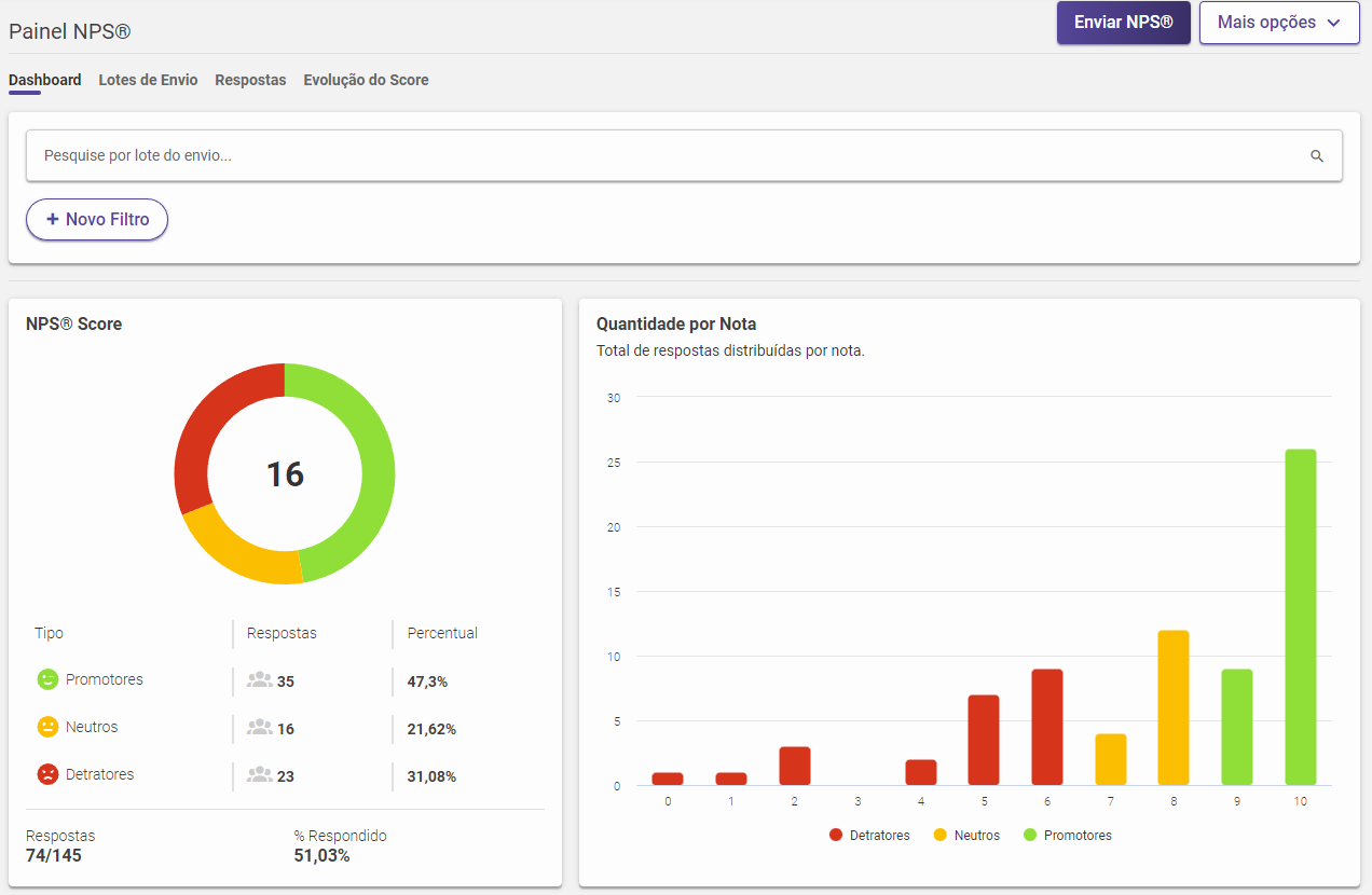 O módulo de NPS é dividido em 4 abas: Dashboard, Lotes de Envio, Respostas e Evolução do Score.