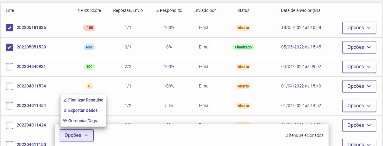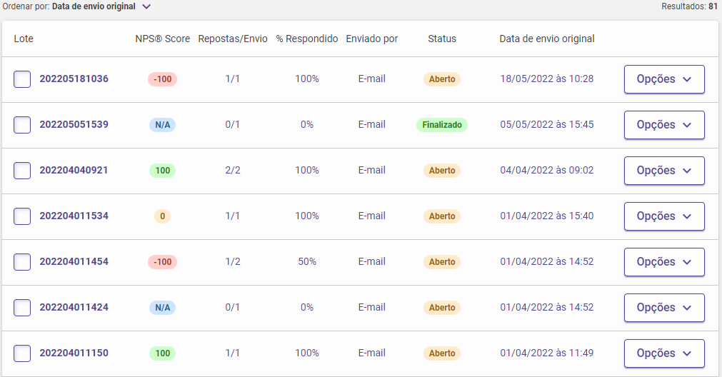 Através do botão Opções presente ao lado direito de cada lote de disparo é possível: