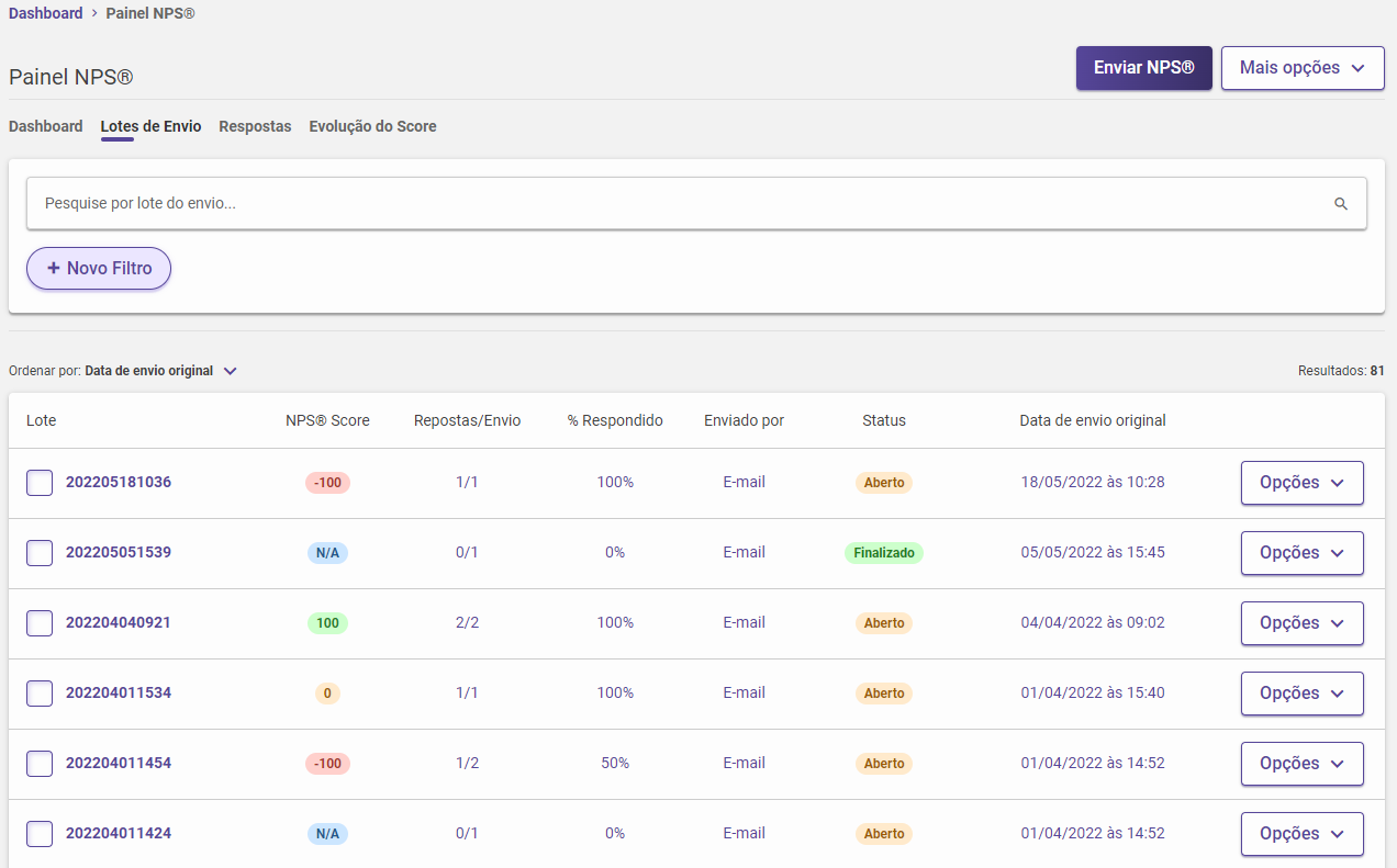 O botão Enviar NPS direciona para o disparo de pesquisa, onde é possível realizar filtros e executar o disparo.