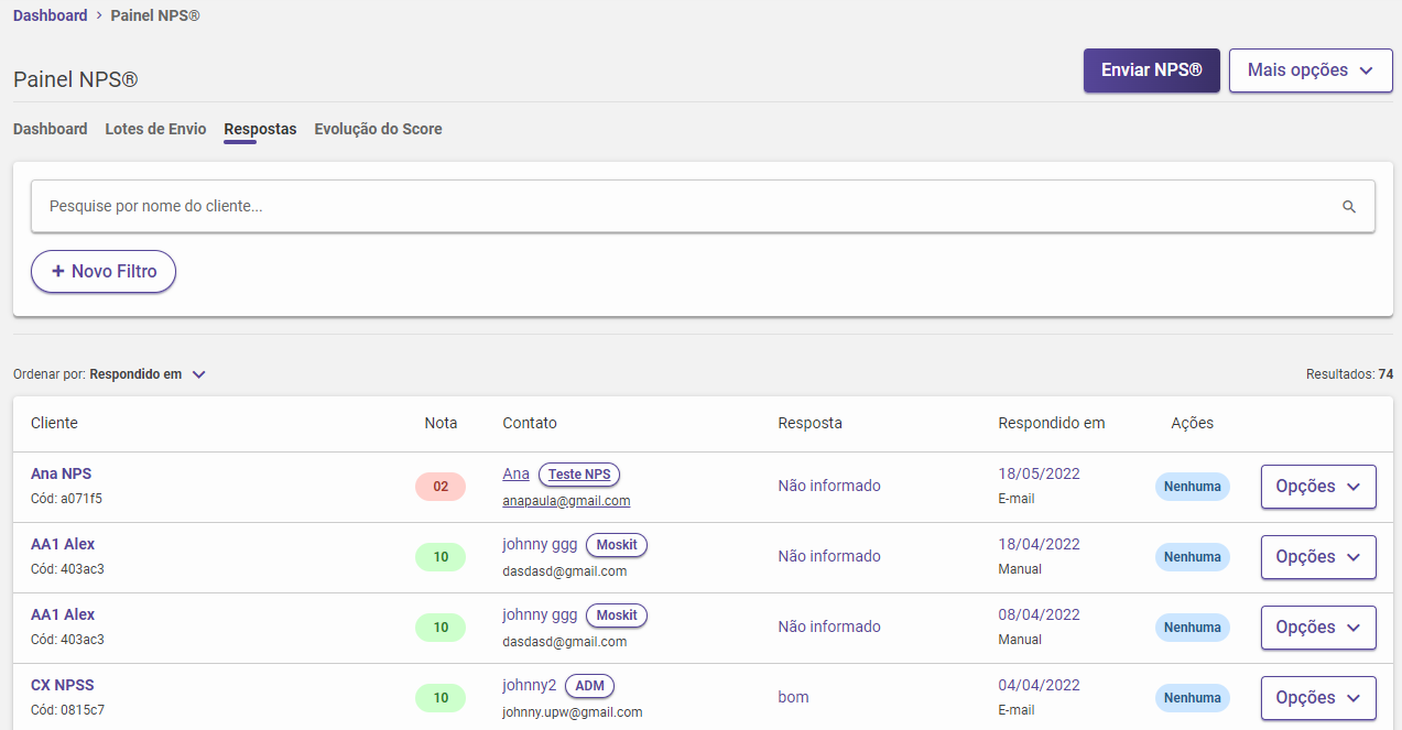Na parte superior temos o botão de filtro onde é possível filtrar por data da resposta, tags, dados de cliente, entre outras informações.