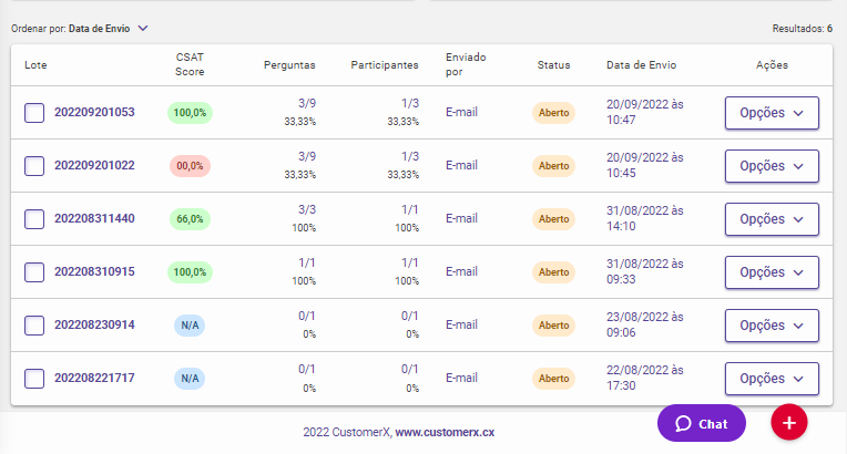 O botão "Enviar CSAT" direciona para o processo de personalização da pesquisa até a execução do disparo. Os detalhes estão descritos aqui ;