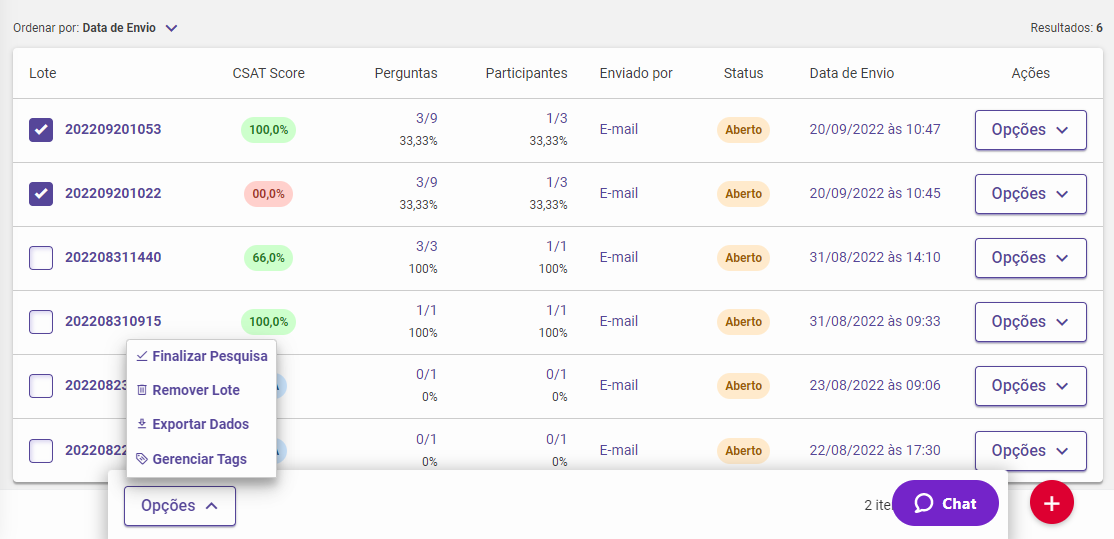 Nesta aba é exibido todos os lotes de disparo e com o auxílio dos filtros, podemos identificar um determinado lote de forma dinâmica e rápida.