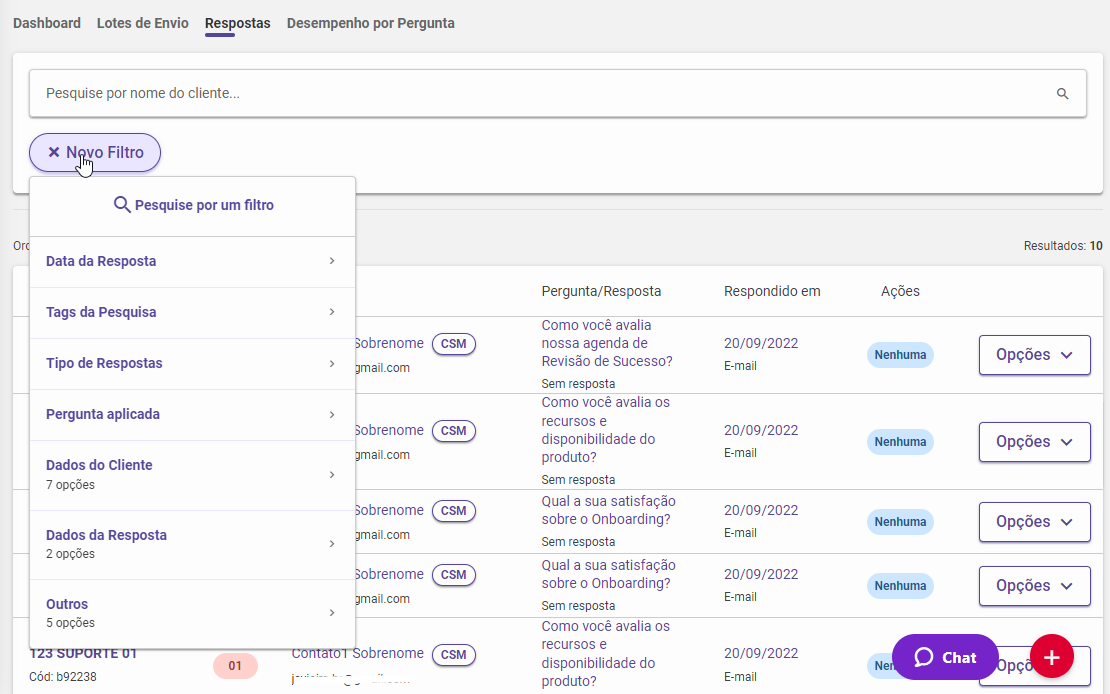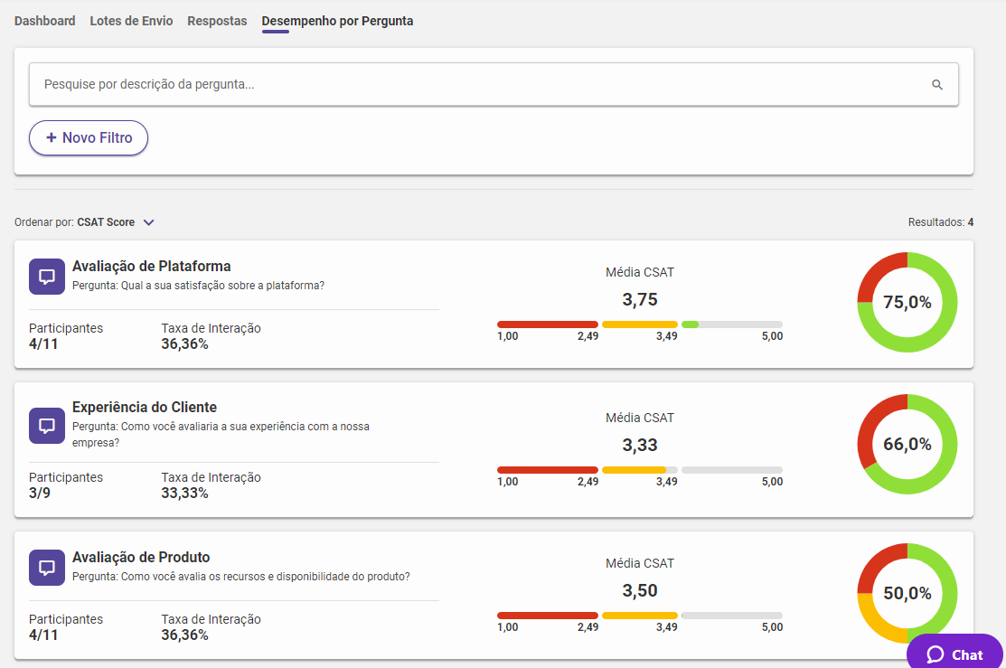Nesta aba é possível acompanhar o desempenho de cada pergunta que foi respondida pelo cliente e o campo para realizar filtros é mantido para ser explorado as possibilidades de análise.