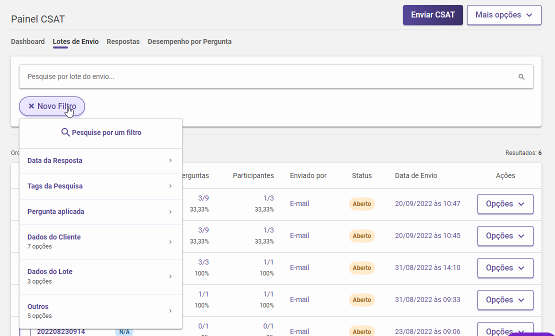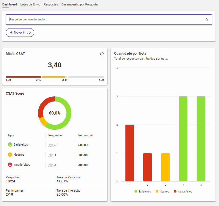 Este módulo está disponível no menu "Pesquisas > Painel CSAT" e está dividido em 4 abas: Dashboard, Lotes de Envio, Respostas e Desempenho por Pergunta.