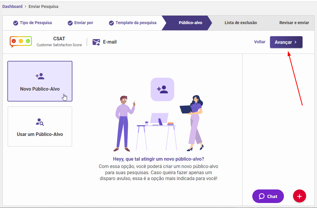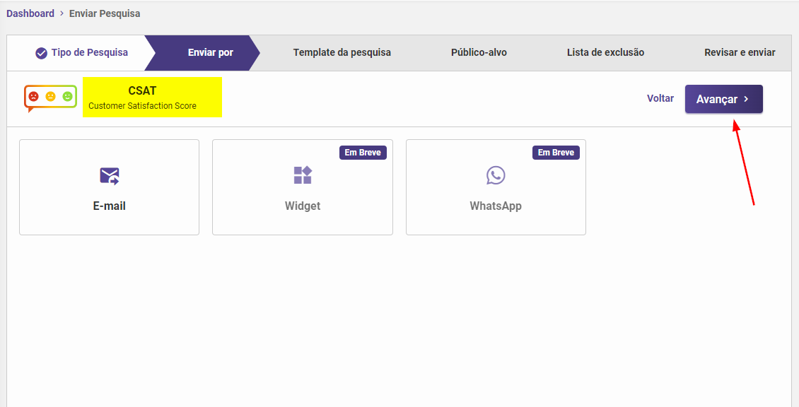 Na próxima tela o tipo de Pesquisa "CSAT" já está selecionada, então selecione qual é tipo de envio que deseja realizar, em seguida, clique em "Avançar >":