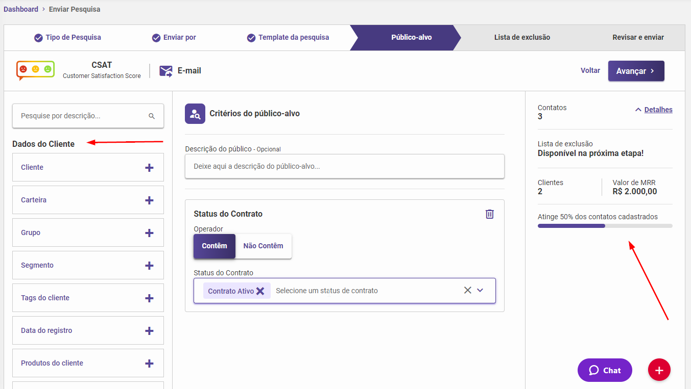 Na próxima tela é possível construir o Público-Alvo com os dados do clientes, dados do contato, indicadores do cliente, dados da última pesquisa, dados do contrato e/ou regionalidade do cliente.