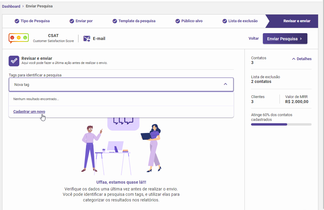 Nesta fase você pode revisar os dados antes de efetivar o envio da pesquisa e também é possível identificar a pesquisa com tags para categorizar os resultados nos relatórios.