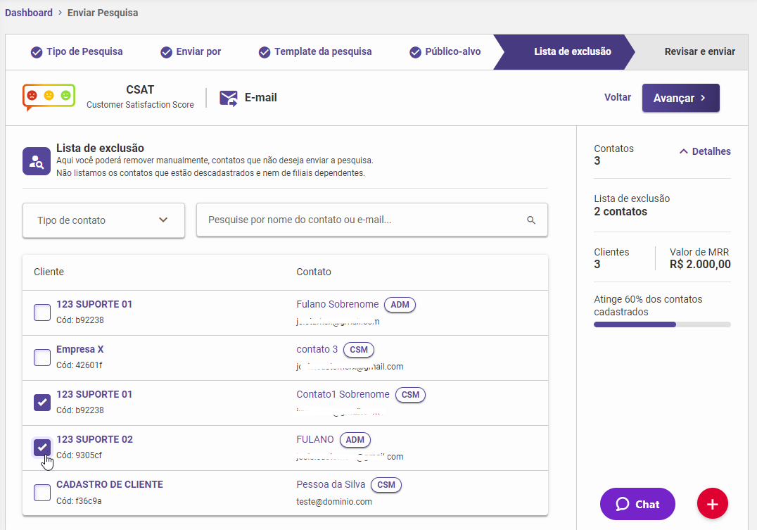 Caso tenha algum contato que não deve receber a pesquisa, localize o contato e deixe marcado. Se a sua base está estruturada com o "tipo de contato", pode utilizar o filtro como apoio.