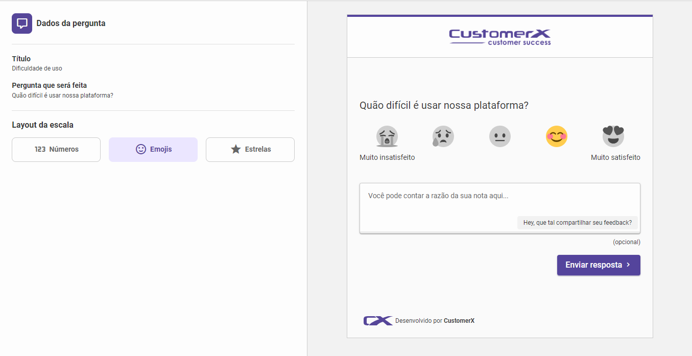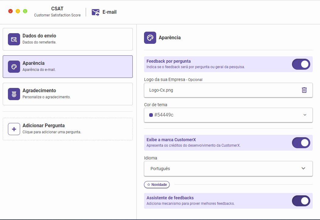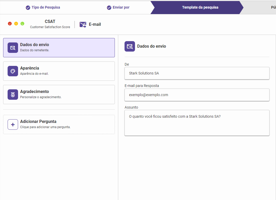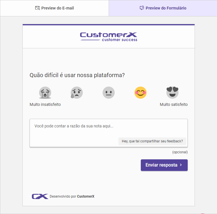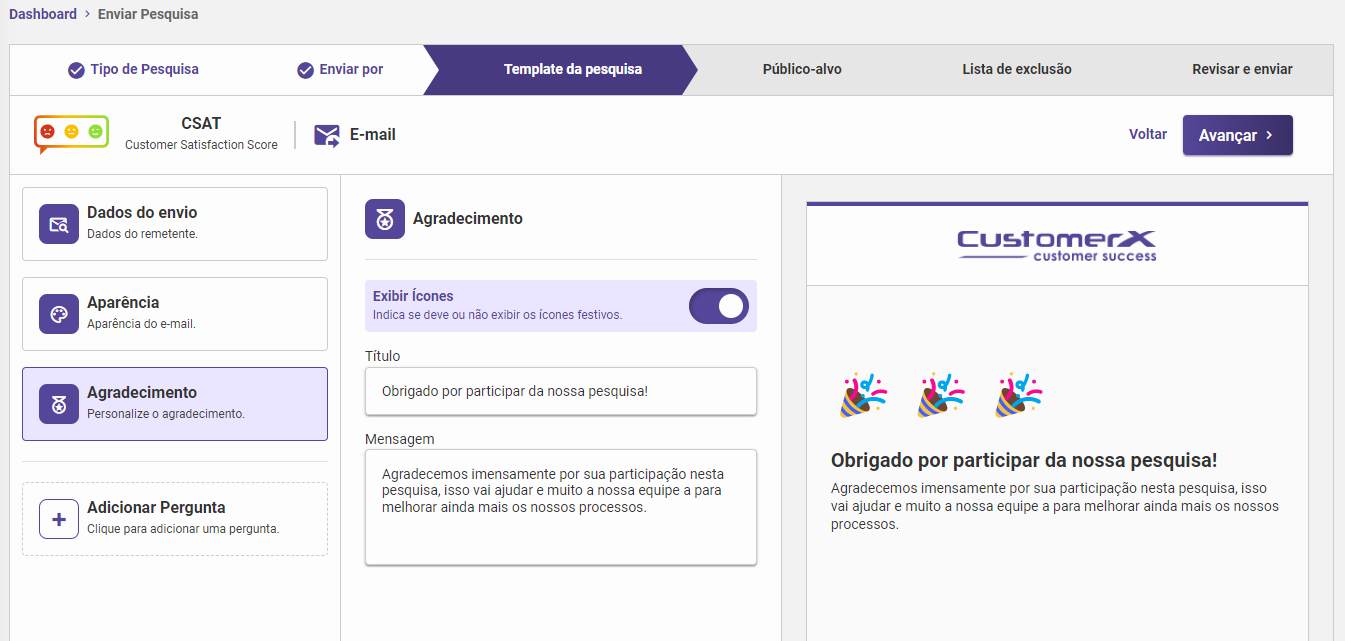 Nesta fase os clientes da CustomerX podem personalizar a pesquisa. Durante a configuração, ao lado direito da tela, temos a pré-visualização do e-mail que será recebido pelo cliente final.