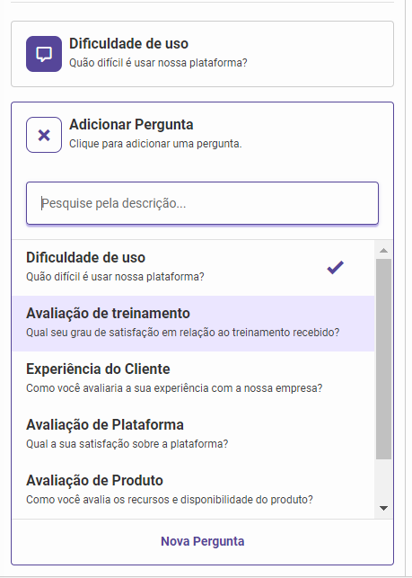 Com esse parâmetro ativado, o sistema vai solicitar um campo de feedback por pergunta que for adicionado ao formulário da pesquisa. Caso desativado, apenas um campo de feedback será apresentado ao fim do formulário.